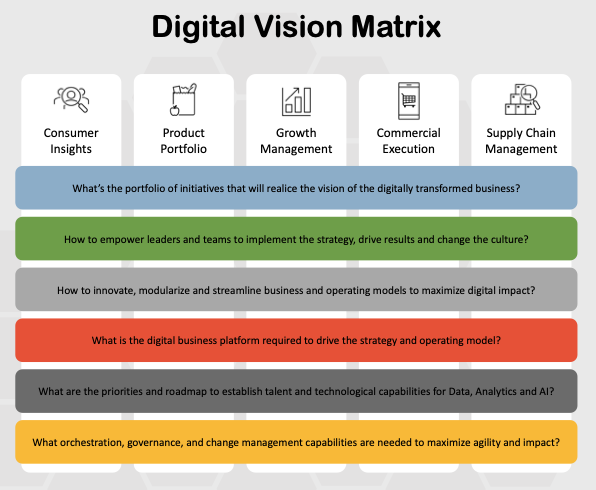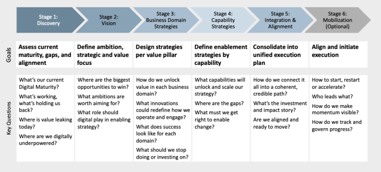 Deliverables: digital strategy narrative, vision matrix, capability map, integrated roadmap, and investment plan
