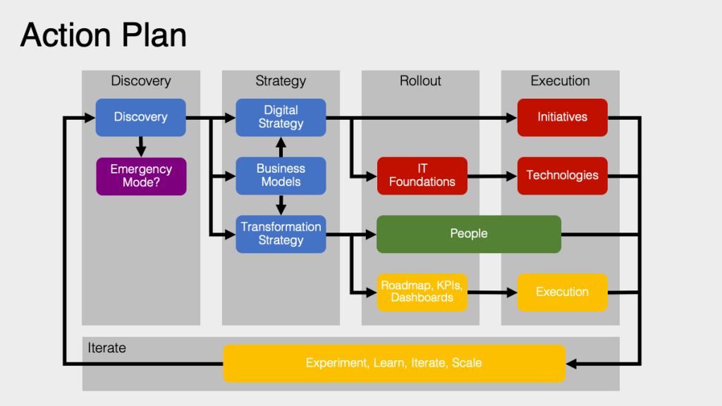 The digital strategy defines how the business will be transformed using technology: finding, engaging and improving the experience of customers, making decisions, optimizing or automating processes, managing or enhancing the supply chain, etc. Good digital strategies will be built around “pillars” that will evolve very slowly, and initiatives prescribing shorter term changes with specific goals. In my experience, most digital strategies have a few common pillars (customer experience, data-driven decision making, process automation) and a few that are industry or case specific (IOT, industry 4.0, etc.)