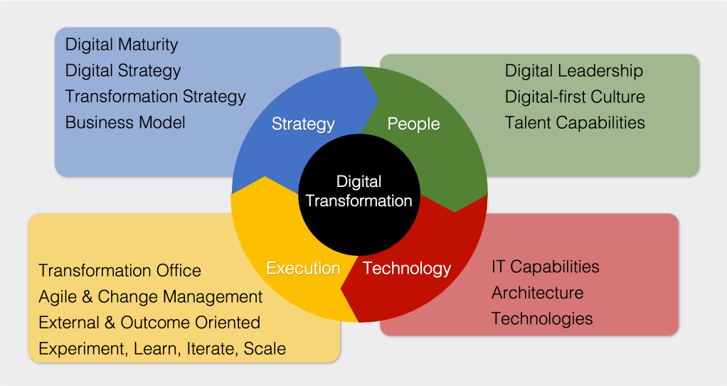 Academics, analysts and consultants have studied successful (and failed) Digital Transformation stories and while their proposed recipes differ, they point to four key ingredients to maximize the chances of succeeding: getting the strategy right, fostering suitable leadership and culture, assertively driving change and, of course, implementing successful technology empowered initiatives.
